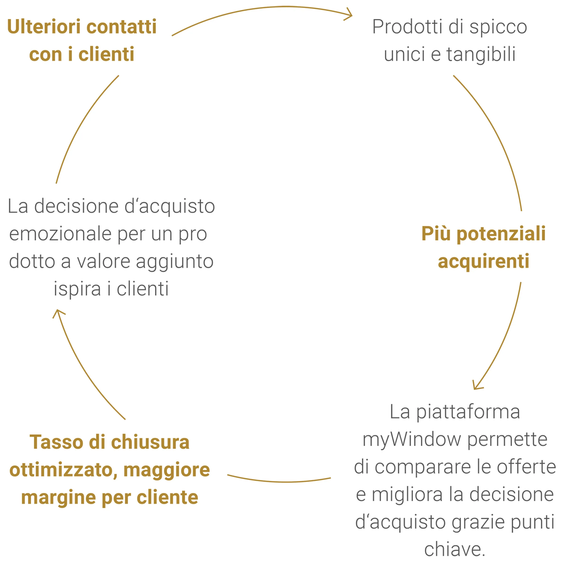 Strumenti e supporti digitali efficaci rendono il processo di vendita divertente e finalizzato, concentrandosi sempre sulle esigenze del cliente finale. Con il concetto omnicomprensivo di myWindow, puntiamo ad ispirare i clienti. Pertanto l'azienda si concentra costantemente sulle esigenze del cliente finale.
